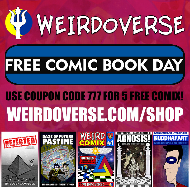 In honor of free comic book day  I have created a coupon code over at my Weirdoverse comic book shop that bestows a 100% discount on any & all comix available for purchase! Use coupon code 777 to download your free comix today  :fnord: :fnord: :fnord: